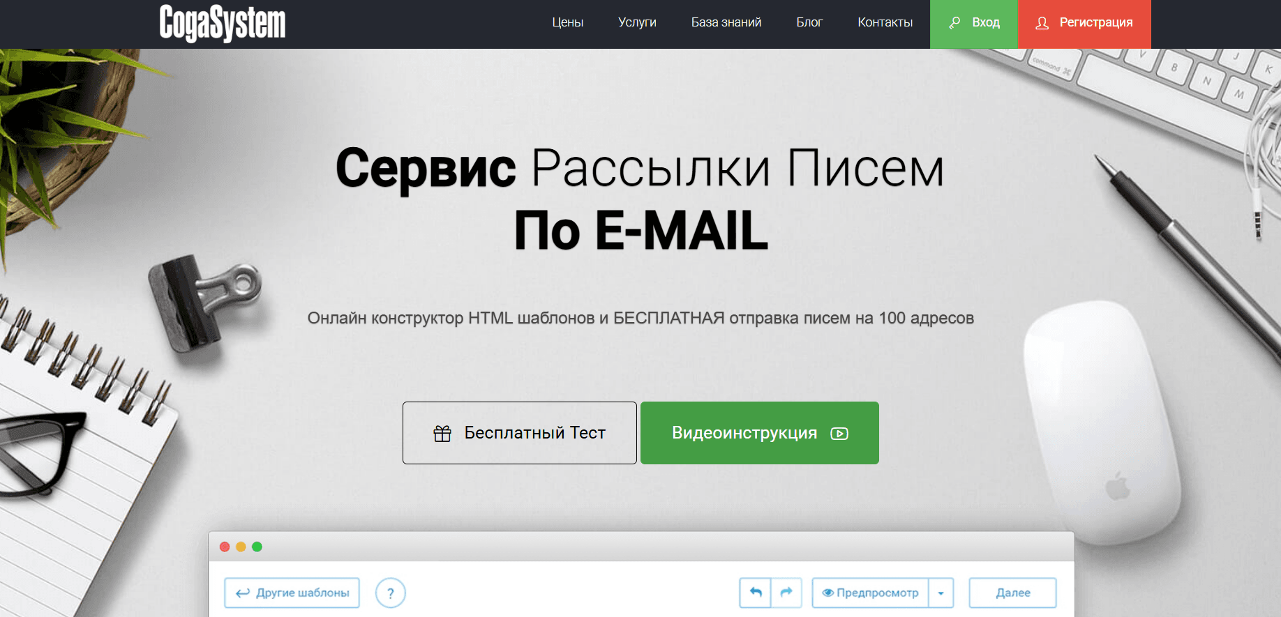 - Удобный редактор и готовые шаблоны.