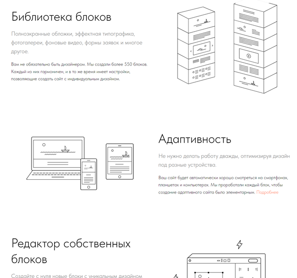 Одной из особенностей Tilda является ее библиотека Zero Block, позволяющая создавать полностью кастомные блоки с нуля. Это дает пользователям большую гибкость в дизайне и настройке.