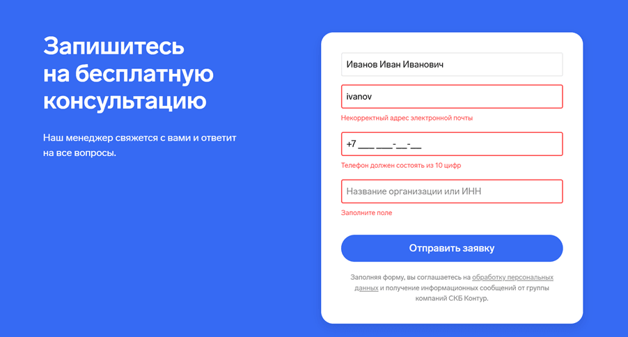 В форме заявки на предоставление услуги дизайнеры Контура позаботились о том, чтобы человек, забывший ввести данные и заполнивший их неверно, сразу же узнал об этом.