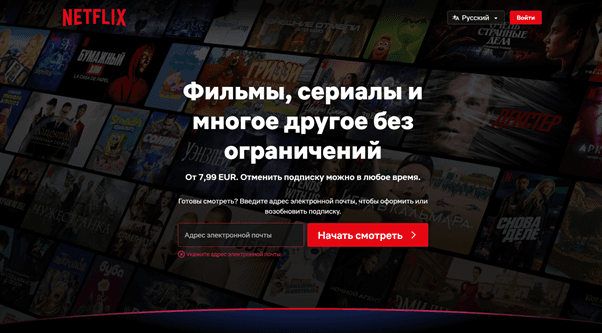 На сайте Netflix CTA-кнопка выделяется ярким красным цветом и мгновенно заметна.