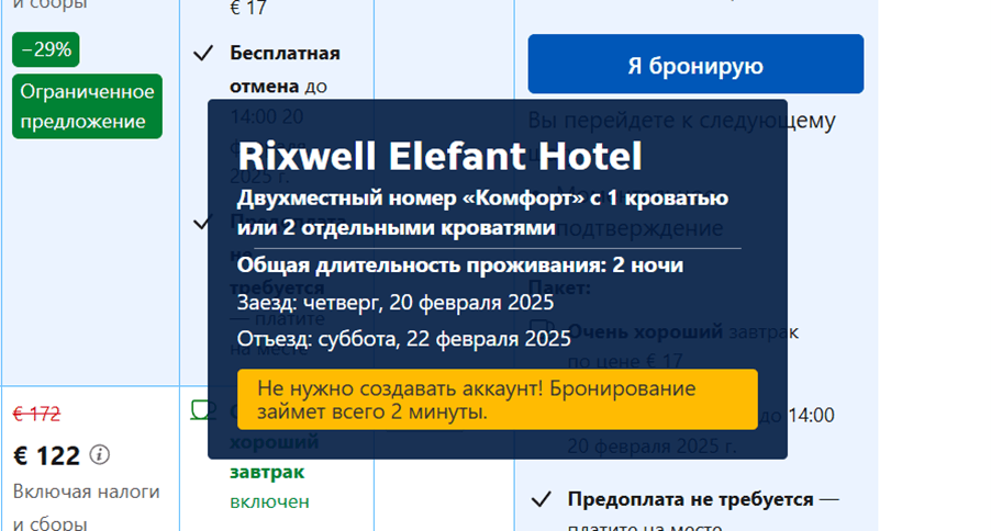На сайте Booking.com при наведении на кнопку «Я бронирую» всплывает обобщающая информация по предстоящему бронированию, а также сноска, убеждающая в быстроте и легкости оформления.