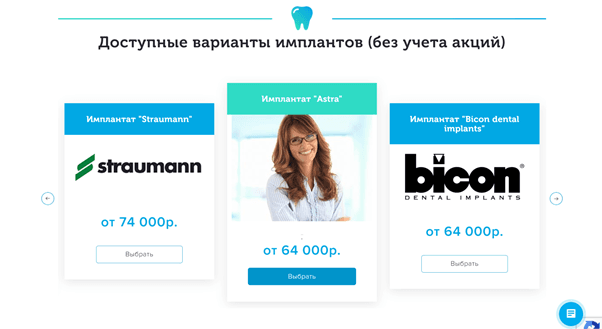 Начальная стоимость, название импланта, четкая CTA-кнопка.