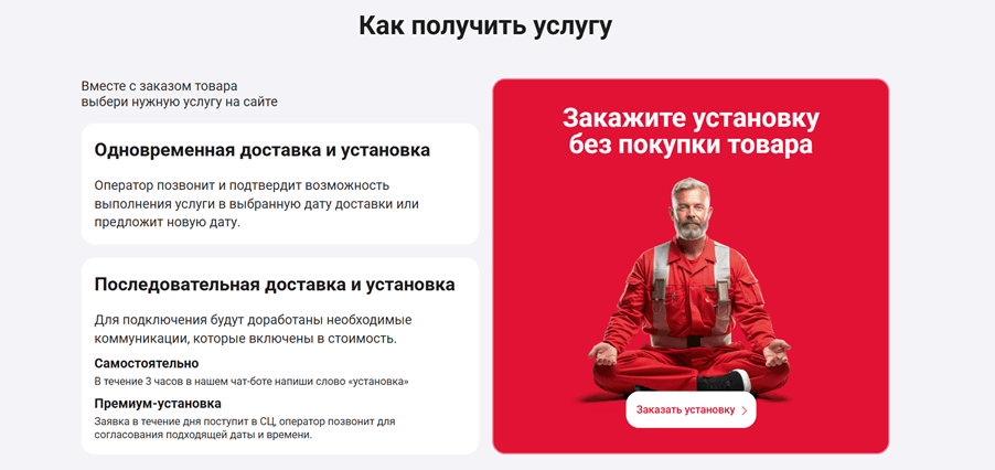 Страницы услуг М.Видео демонстрируют отличную визуальную иерархию: крупные заголовки привлекают внимание, а дополнительные детали аккуратно организованы в блоки с подзаголовками и списками.