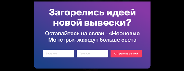 Для различных сфер деятельности на первом экране будет впечатляюще смотреться анимация. Например, компания по изготовлению неоновых вывесок «продлила» первый экран анимацией с красочным неоновым изображением: