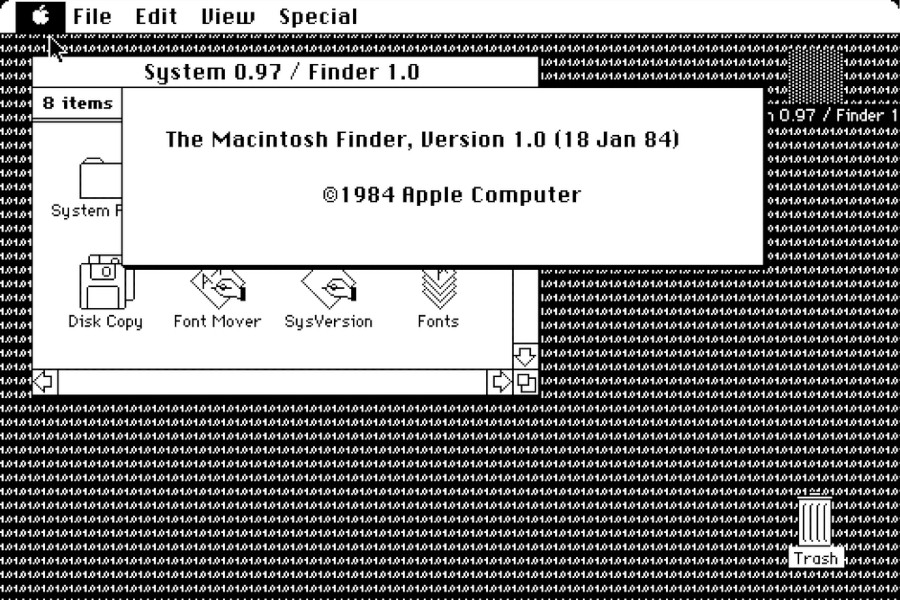Тогда пользователи получили в своё распоряжение рабочий стол, окна, строку меню, иконки, папки, документы, приложения и корзину. Первое, на что хотелось бы обратить ваше внимание, – низкое разрешение, отсутствие иконок в списках и других цветов, кроме белого и чёрного. В то же время сама структура достаточно неплохо знакома и разобраться в ней современному пользователю совсем не сложно.