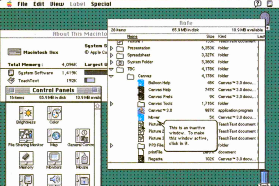 Последняя предлагала куда большую цветовую палитру и функцию “BalloonHelp” – систему помощи новичкам, в которой при наведении курсора на объект появлялось поле с его описанием. Рабочий стол в этой системе тоже получил куда больше настроек. Чего только стоила цветная иконка “Apple” в левом верхнем углу!