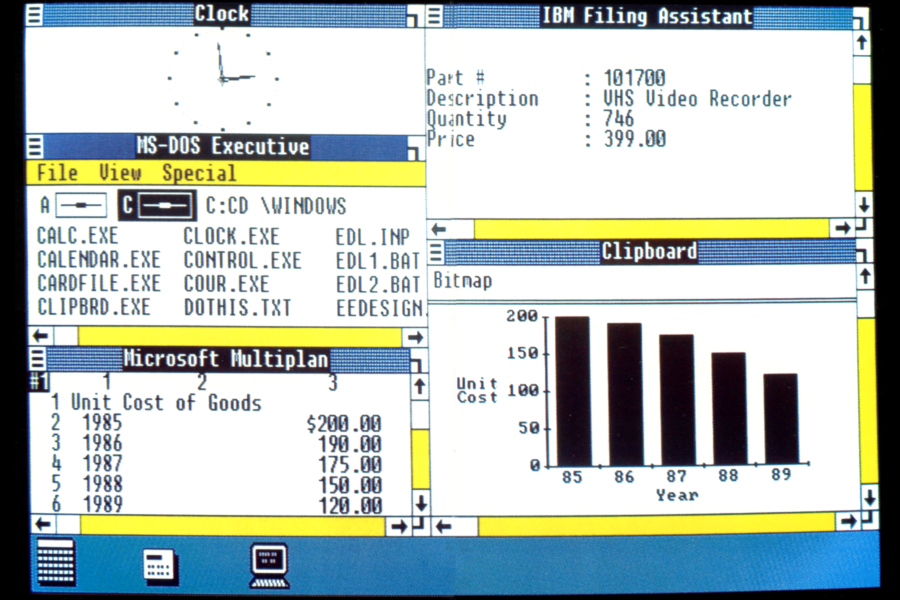 Интерфейс операционной системы “MicrosoftWindows1.0”, выпущенной в 1985-ом году, был предназначен для упрощения работы с “MS-DOS” и периферийным оборудованием, а также для стандартизации внешнего вида приложений. Пользователи встретили его с некоторой прохладцей из-за зависимости от дорогого по тем временам оборудования в виде мыши, памяти большого объёма и процессора новой модели.