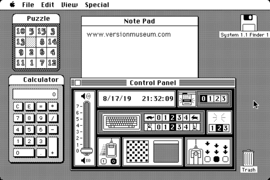 В уже привычном для него левом верхнем углу находится строка меню “Apple”, а иконки на столе доступны к перетаскиванию. Панель управления достаточно компактна, впрочем текстовых меток на ней нет, равно как и команды выключения, а также «Новой папки». Дело в том, что тогда по умолчанию была доступна лишь одна папка, которую можно было копировать нескончаемое количество раз.