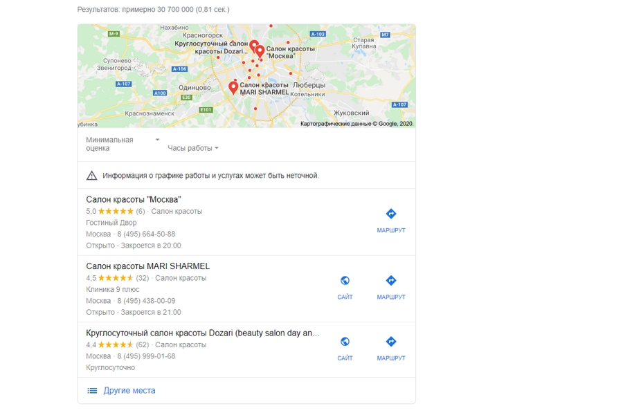 Важно, чтобы в результате они обнаруживали всю необходимую информацию: точный адрес, распорядок работы, номер телефона, адрес сайта, фотографии. В ряде случаев карты “Google” и “Yandex” могут стать одним из основных источников продаж и трафика. Это говорит о том, что о выводе в верхние строчки поисковой выдачи нужно позаботиться компаниям, спрос на сервисы и продукцию которых является ситуативным и имеет привязку к географическому положению. К ним можно отнести: