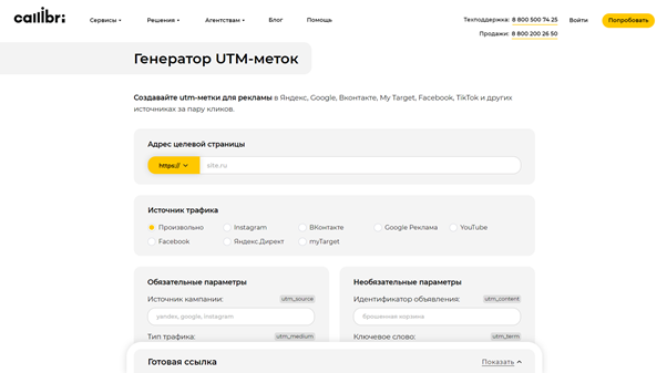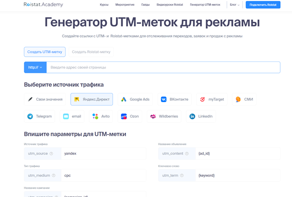 Онлайн-генератор предлагает большое количество источников трафика на выбор: помимо Яндекса, Google, VK и myTarget — Telegram, Avito, Ozon и другие. Может работать как со статическими, так и с динамическими параметрами.