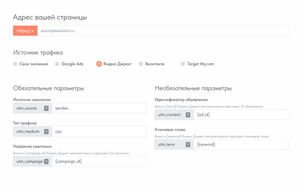 Генератор позволяет оптимизировать ссылки под Google Ads, Яндекс.Директ, VK и Target My.com или вводить собственные значения. Может работать и со статическими, и с динамическими параметрами. После того, как все значения заполнены, сервис покажет результат и предложит сократить ссылку.