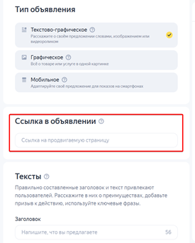 В данном случае ссылку нужно будет сгенерировать самостоятельно для каждого объявления. Заполняется поле внутри Директа в настройках определенного объявления кампании.