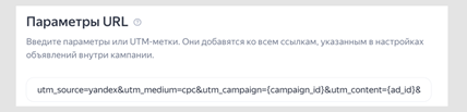 Динамические переменные сделают метки универсальными для всех ссылок. Указать метки можно в разделе «Параметры URL». Единые ютм-метки будут добавлены как к текстовым, так и к графическим типам объявлений, к основным ссылкам, быстрым ссылкам и кнопкам.