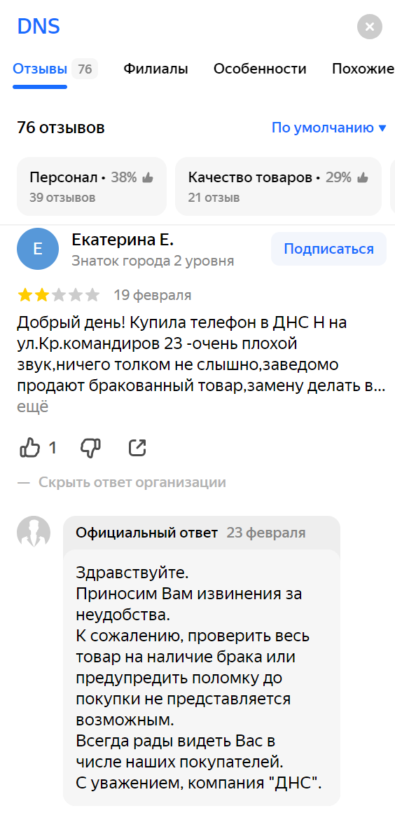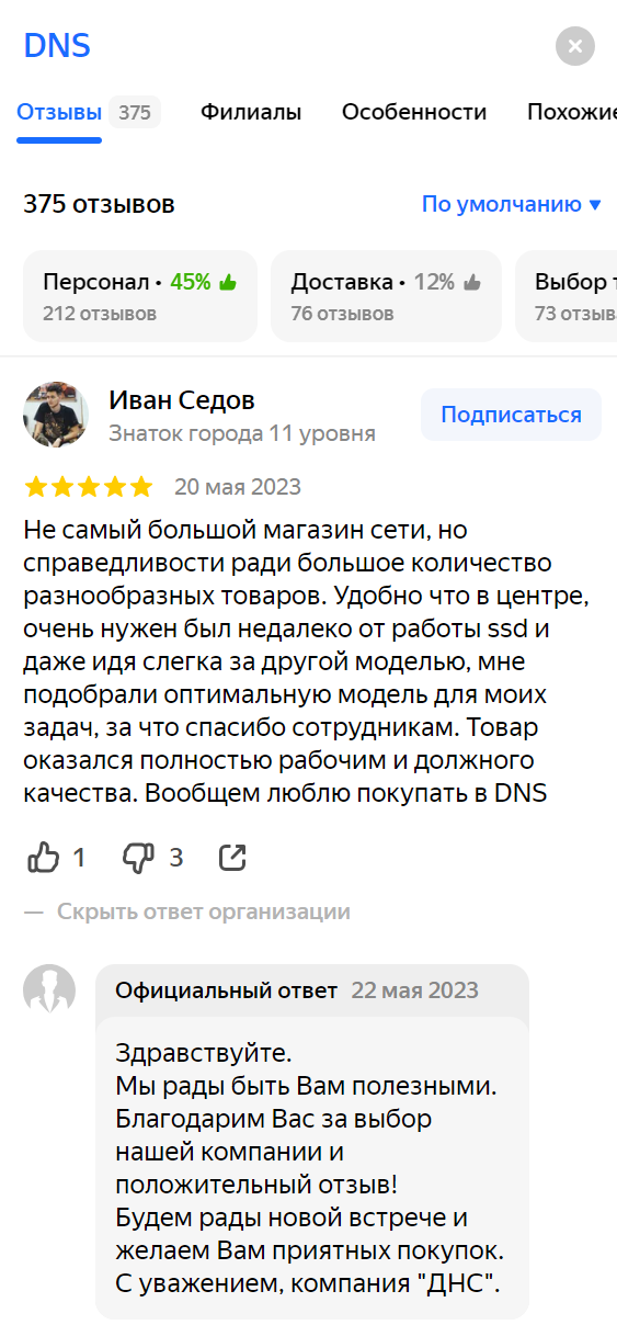 Один из факторов, благодаря которым магазин виден в подсказках — работа с обратной связью пользователей. Например, в Яндекс Картах магазин отвечает как на хорошие отзывы, так и на плохие