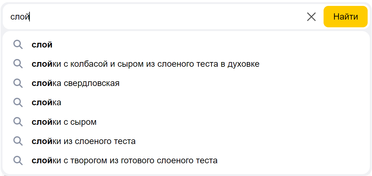 Если пользователь часто ищет рецепты кулинарных блюд, при вводе запроса «слой» всплывающие подсказки Яндекс покажет с теми вариантами, которые учтут интерес юзера к выпечке
