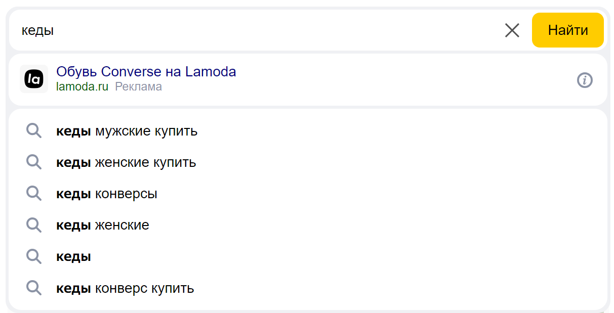 Ранее пользователь вводил запросы «конверсы женские купить» и «кеды конверс». Теперь при вводе запроса «кеды» Яндекс Подсказки предлагают фразы, похожие на прошлые поиски