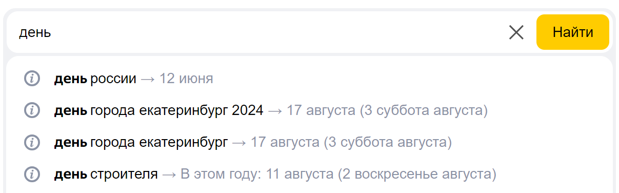 На запрос «день» Яндекс подскажет о праздничных днях, которые будут или случились недавно