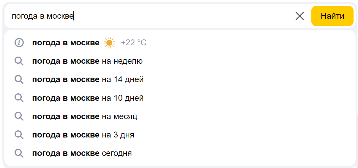 Ввод запроса «погода в Москве» показывает подсказки «на неделю», «на 14 дней» и т.д., поскольку такие варианты ищут чаще всего