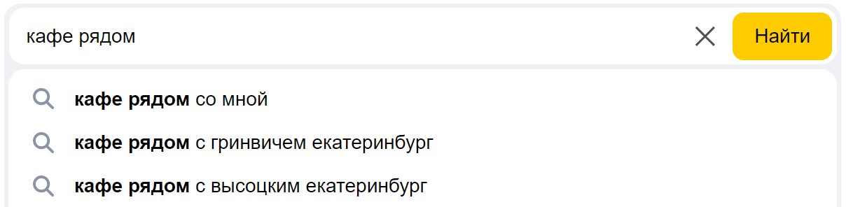 На запрос «кафе рядом» Яндекс даст подсказки, связанные с кафе, расположенными в городе пользователя
