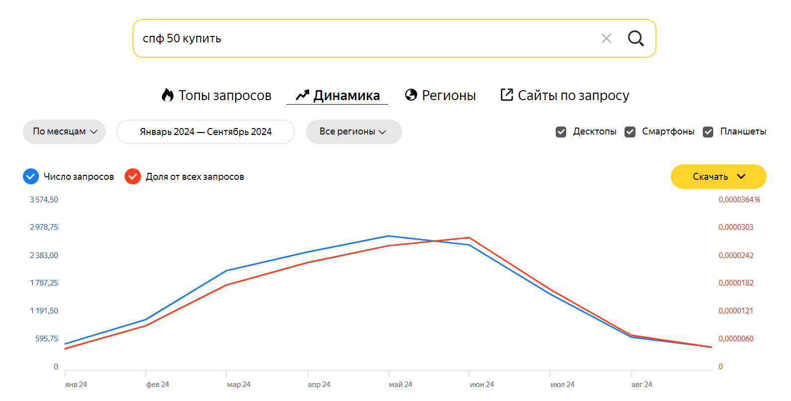 Допустим, вы продаете летние товары. С помощью анализа динамики запросов вы можете заранее узнать, когда начинается рост интереса к вашему продукту. Это позволит вам заранее подготовить рекламные кампании и успеть к началу пика продаж.