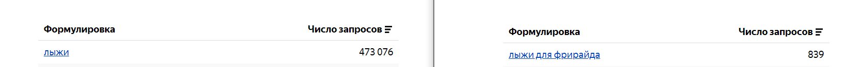 Пример: если вы планируете рекламную кампанию для магазина спортивных товаров, то сначала имеет смысл проанализировать запросы по различным категориям товаров, а затем выбрать те, которые имеют высокий трафик, но невысокую конкуренцию. Например, запрос «лыжи для фрирайда» может оказаться менее конкурентным, чем просто «лыжи», но привлечь более целевую аудиторию.