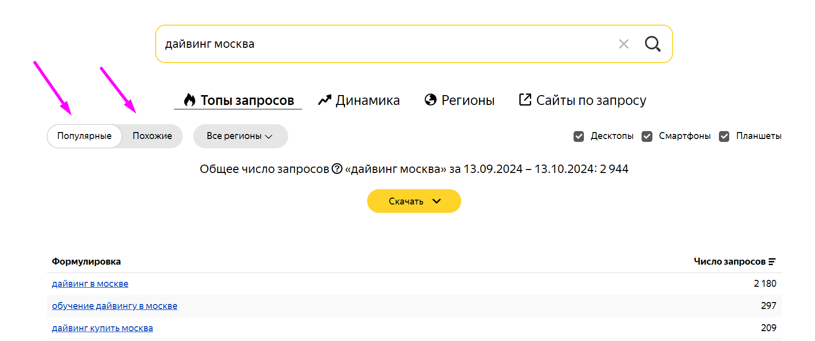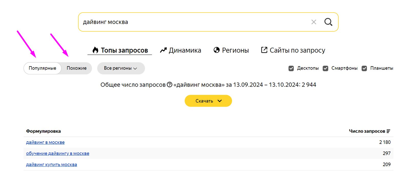 Система предоставит вам статистику по количеству запросов с различными вариантами уточнения — по регионам, устройству, а также по близким по смыслу ключевым словам.