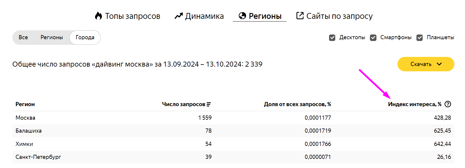 Еще одно полезное нововведение — расширенная статистика по регионам в одном месте. Теперь вместо переключения с «Показов в месяц» на «Региональная популярность» аффинити-индекс можно увидеть сразу при открытии сравнительной таблицы.