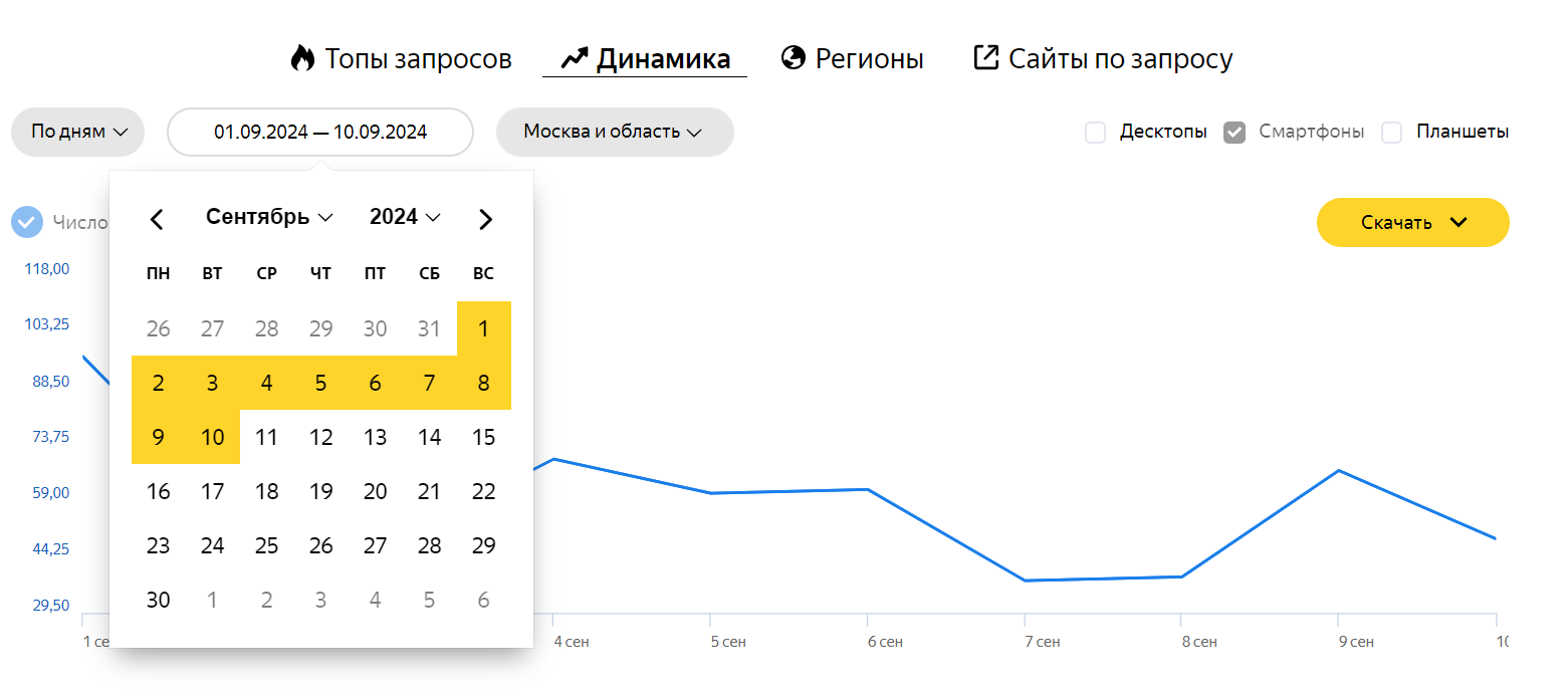 В новом интерфейсе Яндекс Вордстат отображение и функциональность графиков улучшены и делают анализ динамики запросов более наглядным.