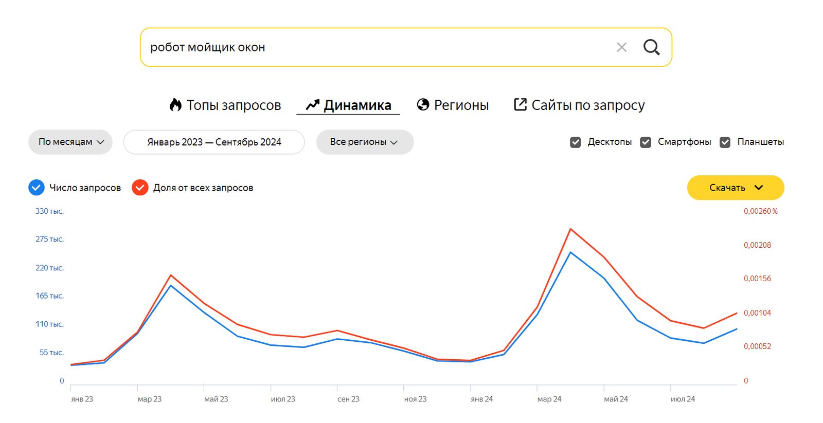 Подавляющая часть людей занимаются мытьем окон только после зимы, но если посмотреть на динамику запросов о роботе-мойщике для окон за 2023 и 2024 год, можно сделать вывод, что некоторая доля людей моет окна с обратной стороны дважды в год — весной и в начале осени.