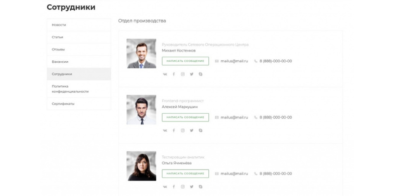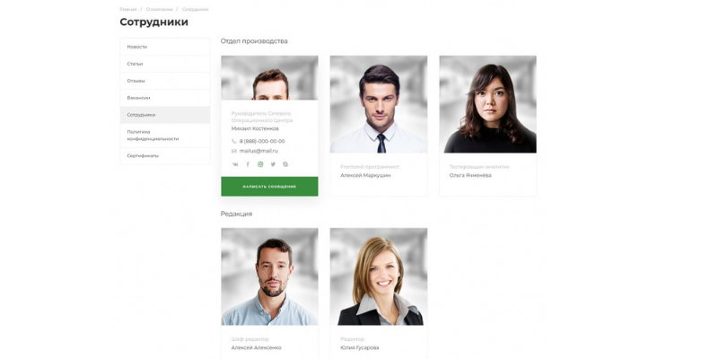 Идеально, если после знакомства с командой пользователь отправляется за покупками или переходит к заказу услуг. Чтобы это происходило чаще, можно добавить кнопку для связи, например – «Задать вопрос» или «Отправить сообщение». В обоих вариантах может быть функция перехода к детальной странице сотрудника, там можно рассказать о нем больше и раскрыть его, как интересную личность.