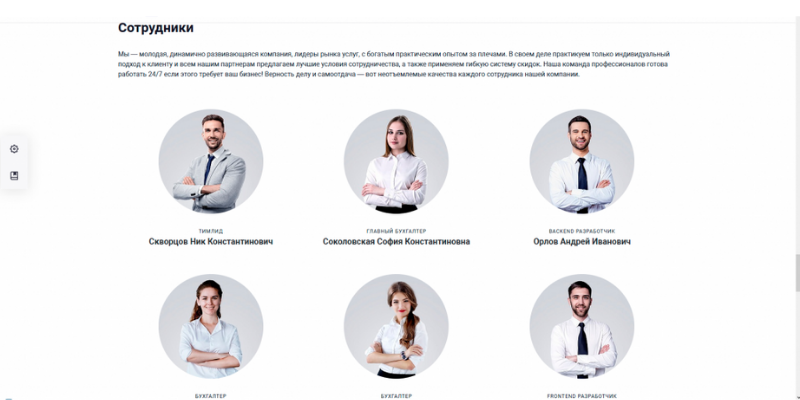 Подобный блок показывает, что по ту сторону экрана находятся настоящие люди, которые являются основателями бизнеса или отличными сотрудниками. Благодаря им бизнес развивается, он персонально ориентирован и предлагает продукты или услуги высокого качества.
