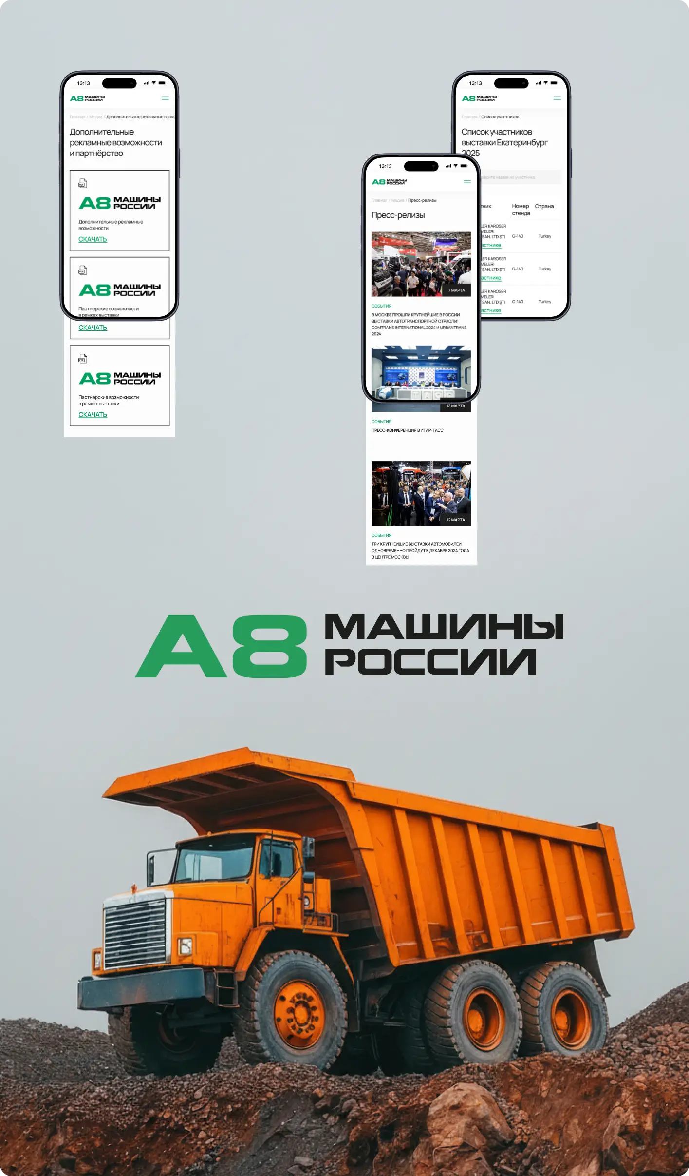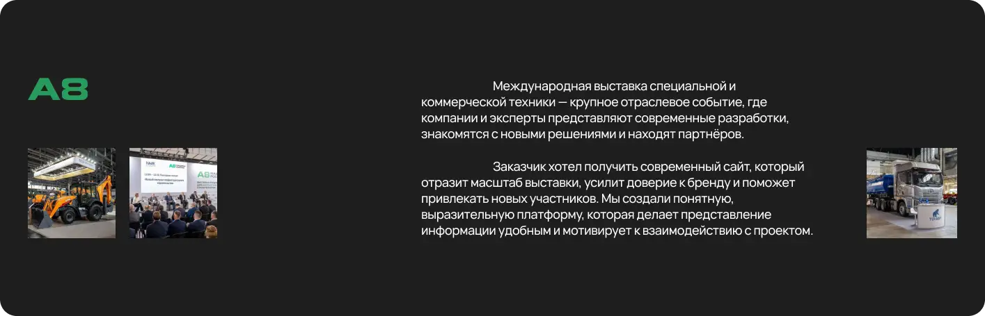 Разработали корпоративный сайт для «А8 Машины России»: создали дизайн, выполнили техническую разработку и интеграцию функциональных модулей. Сайт обеспечивает наглядную презентацию спецтехники, удобную навигацию и сбор заявок, укрепляя онлайн‑присутствие компании.