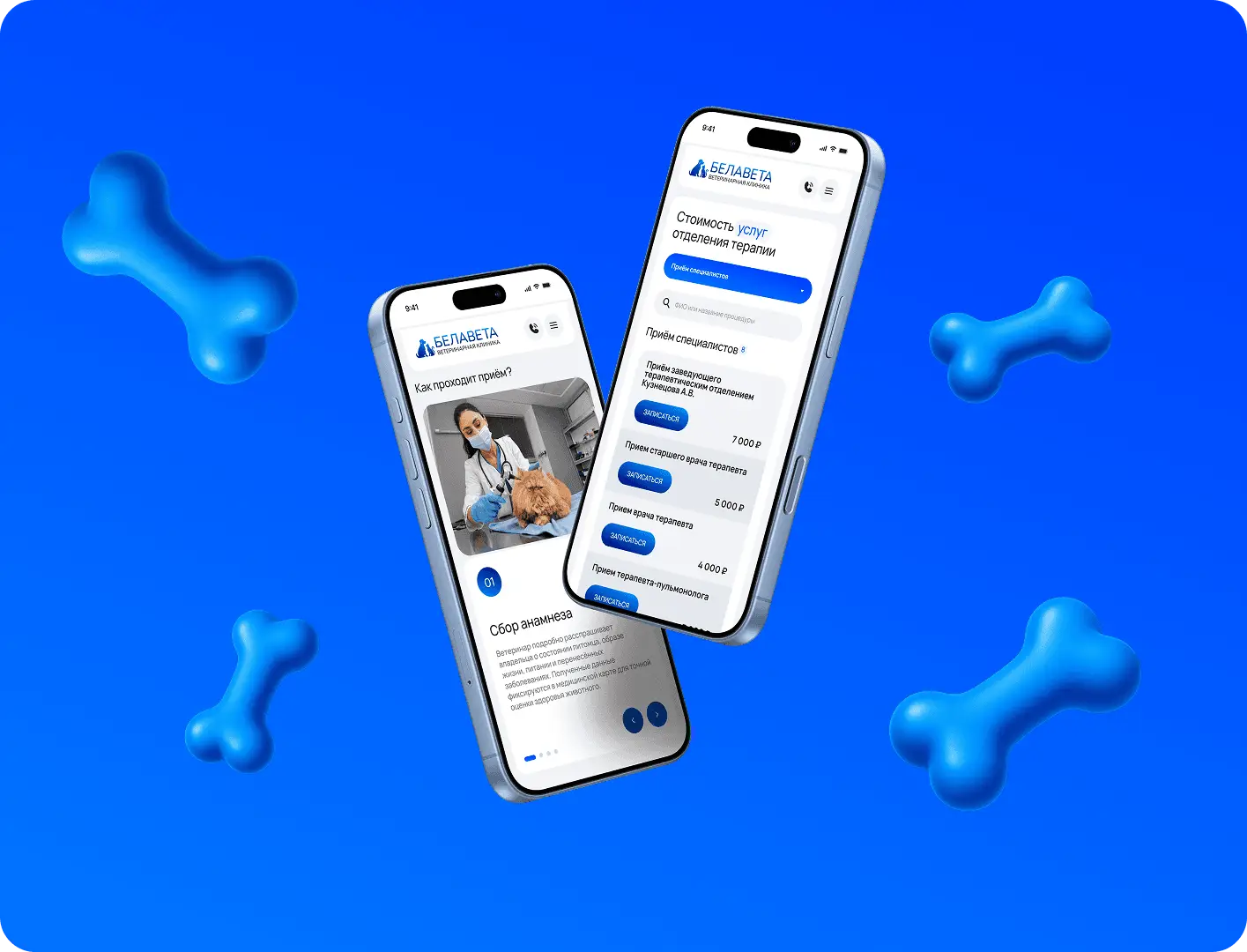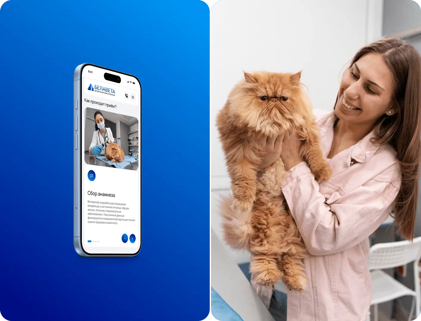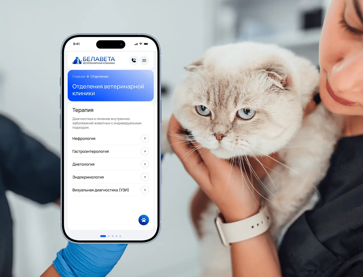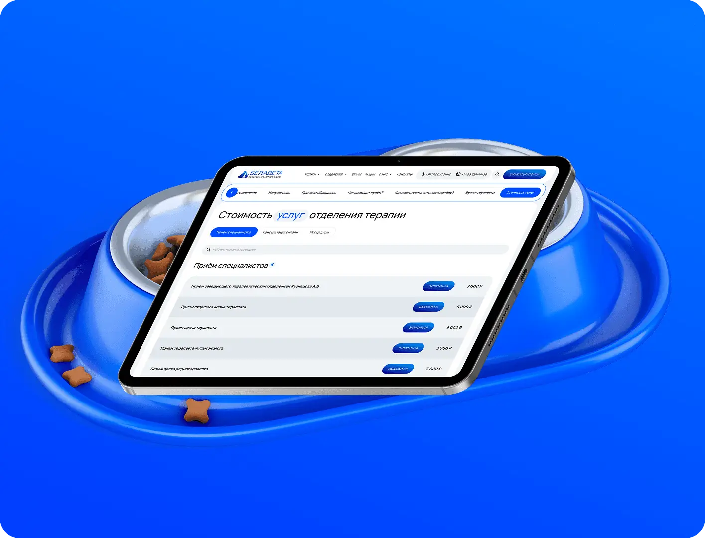 Разработали сайт‑каталог для ветклиники «Белавета» с эстетичным интерфейсом и комфортной цветовой палитрой. Создали структурированные разделы с описанием отделений и услуг. Добавили список врачей с возможностью записи (онлайн и офлайн). Интегрировали онлайн‑оплату. Теперь клиенты быстро находят информацию о клинике, выбирают специалиста и записываются на приём в несколько кликов.