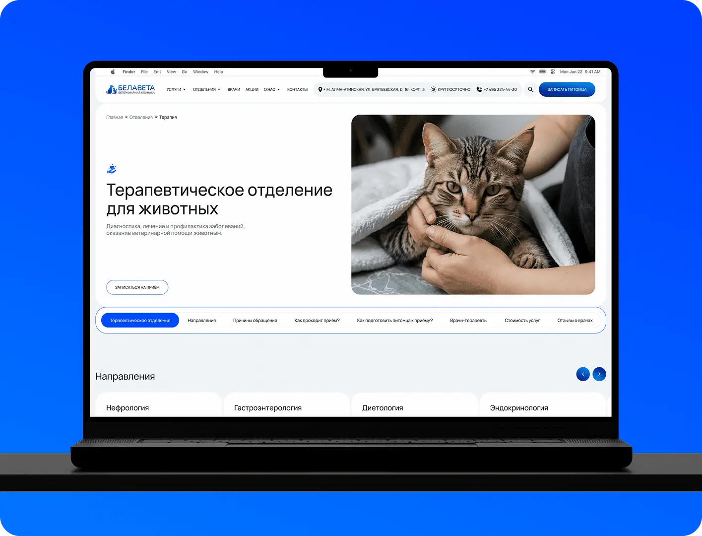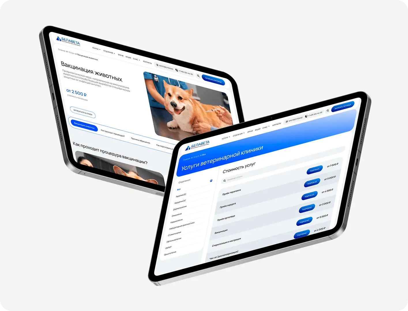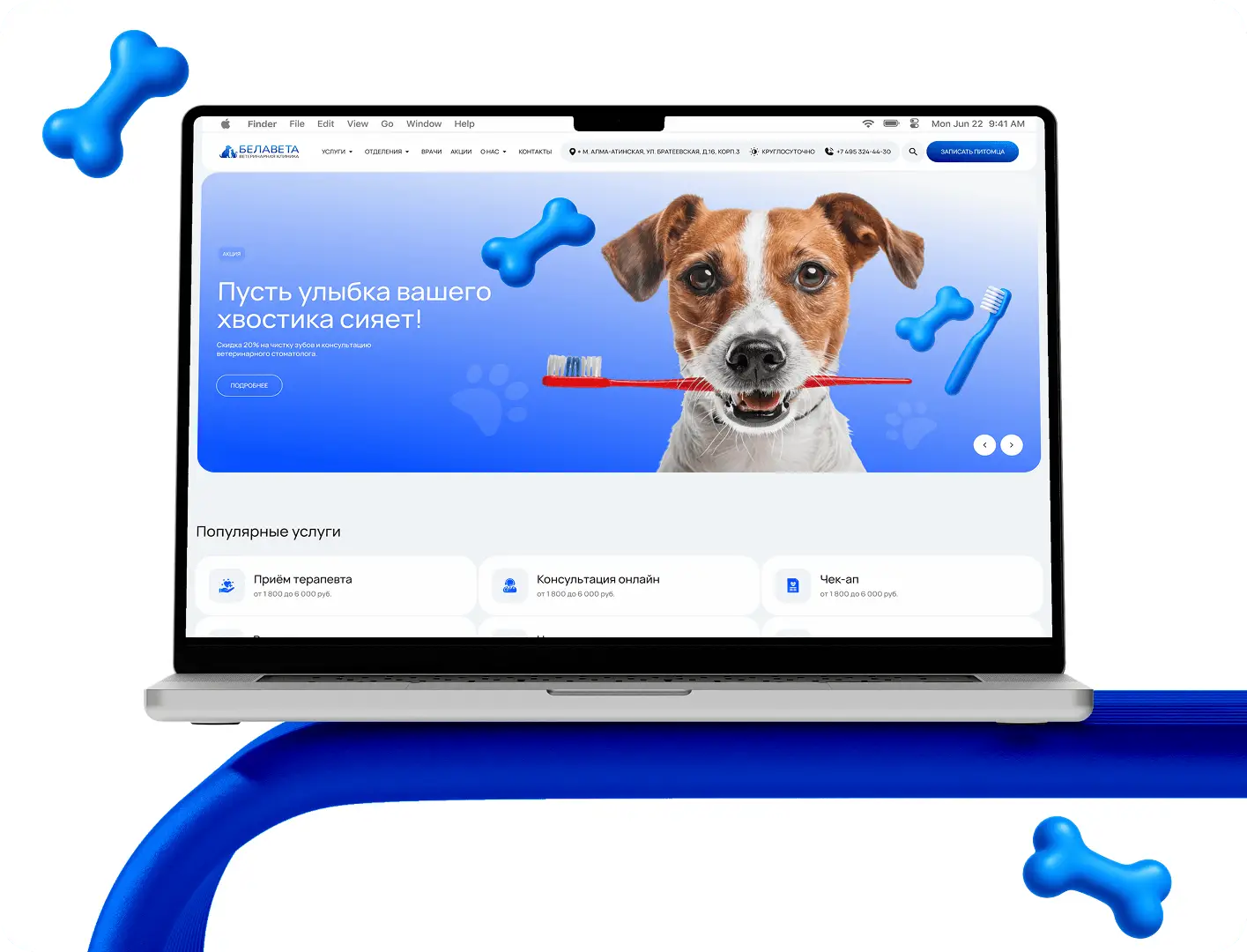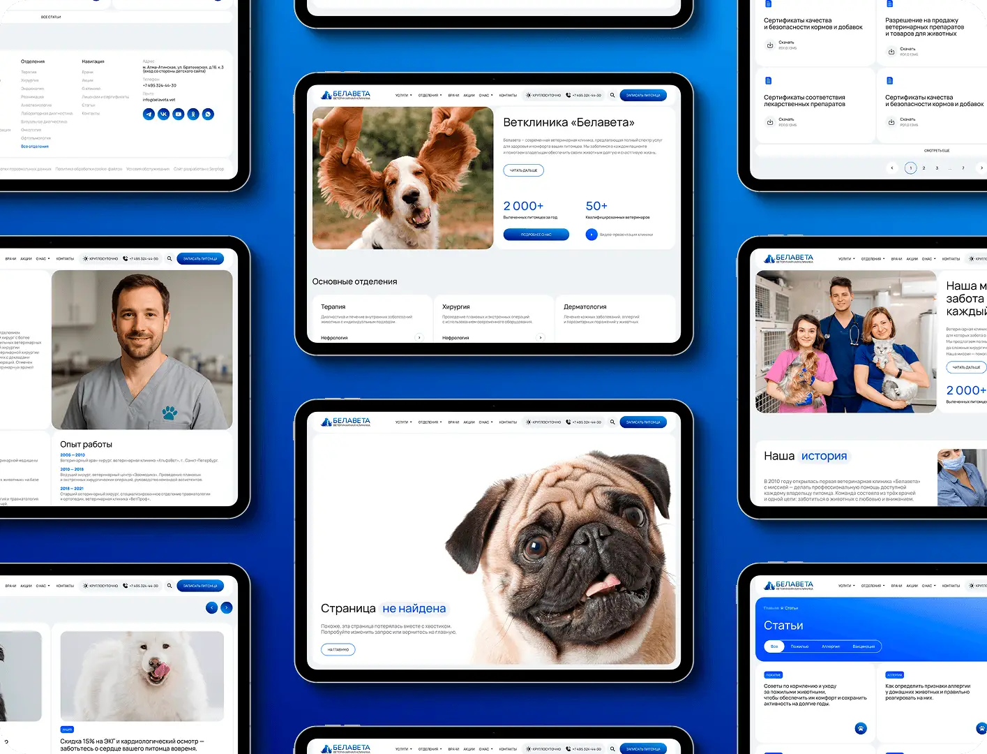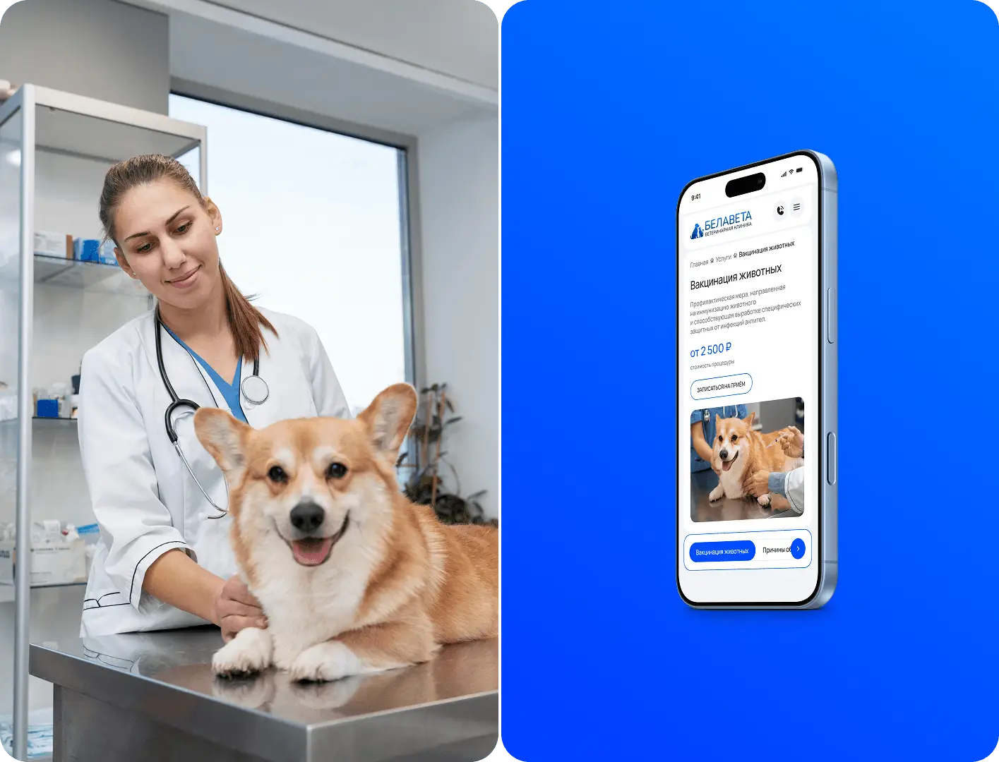 Разработали сайт‑каталог для ветклиники «Белавета» с эстетичным интерфейсом и комфортной цветовой палитрой. Создали структурированные разделы с описанием отделений и услуг. Добавили список врачей с возможностью записи (онлайн и офлайн). Интегрировали онлайн‑оплату. Теперь клиенты быстро находят информацию о клинике, выбирают специалиста и записываются на приём в несколько кликов.