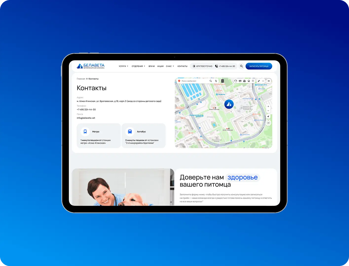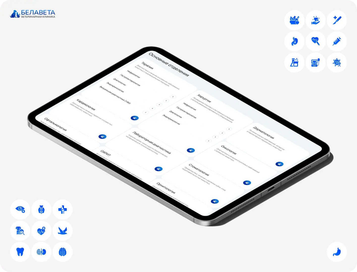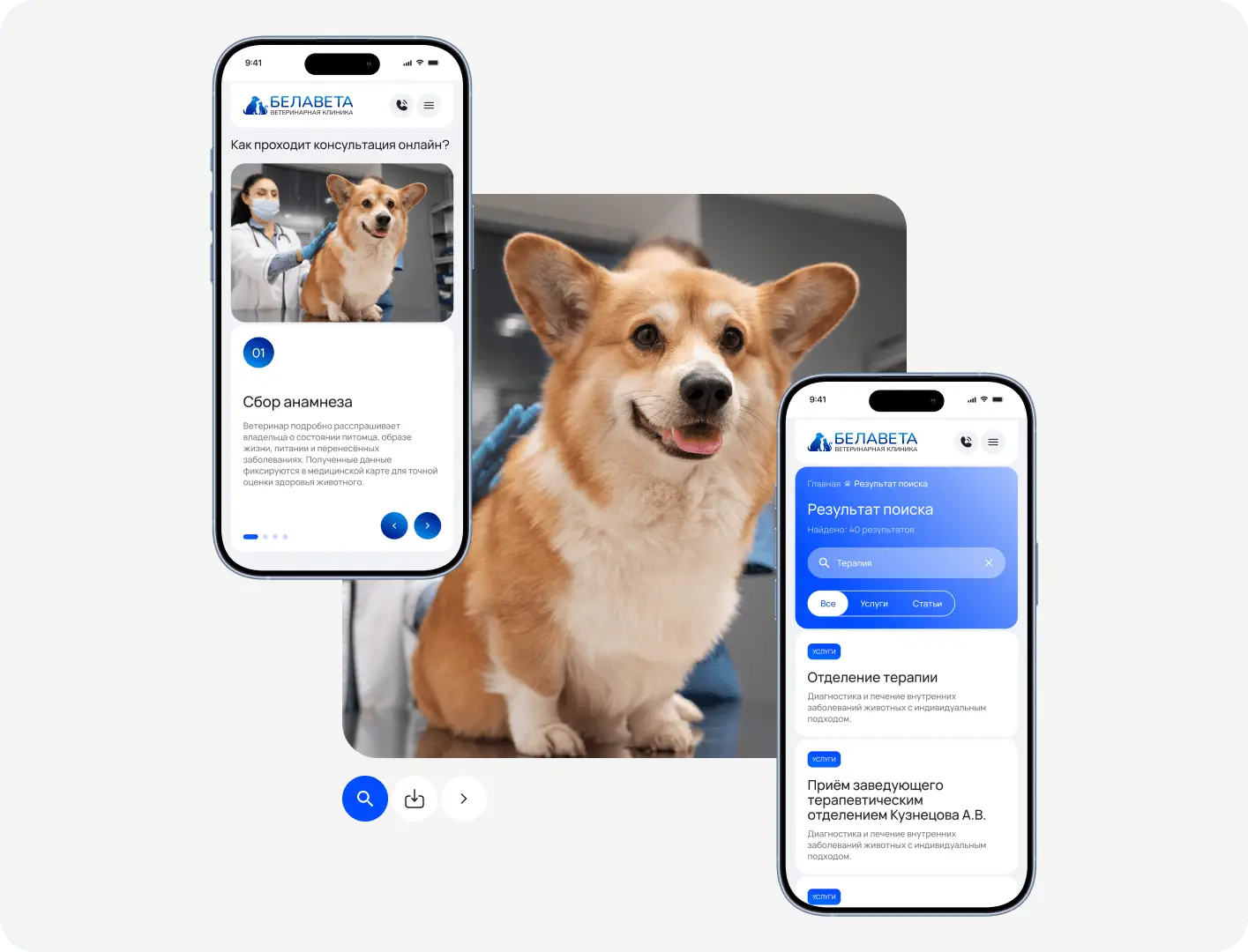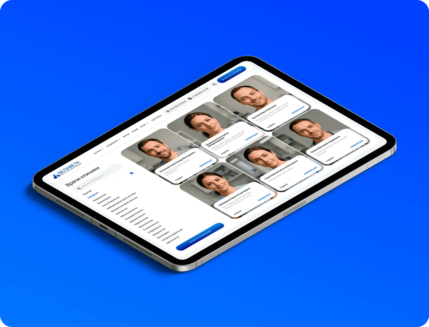 Разработали сайт‑каталог для ветклиники «Белавета» с эстетичным интерфейсом и комфортной цветовой палитрой. Создали структурированные разделы с описанием отделений и услуг. Добавили список врачей с возможностью записи (онлайн и офлайн). Интегрировали онлайн‑оплату. Теперь клиенты быстро находят информацию о клинике, выбирают специалиста и записываются на приём в несколько кликов.