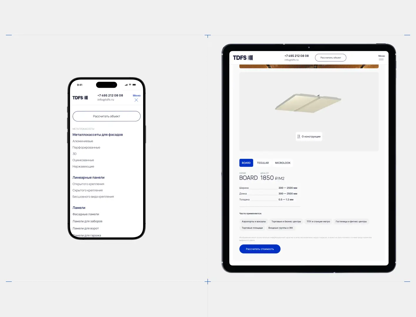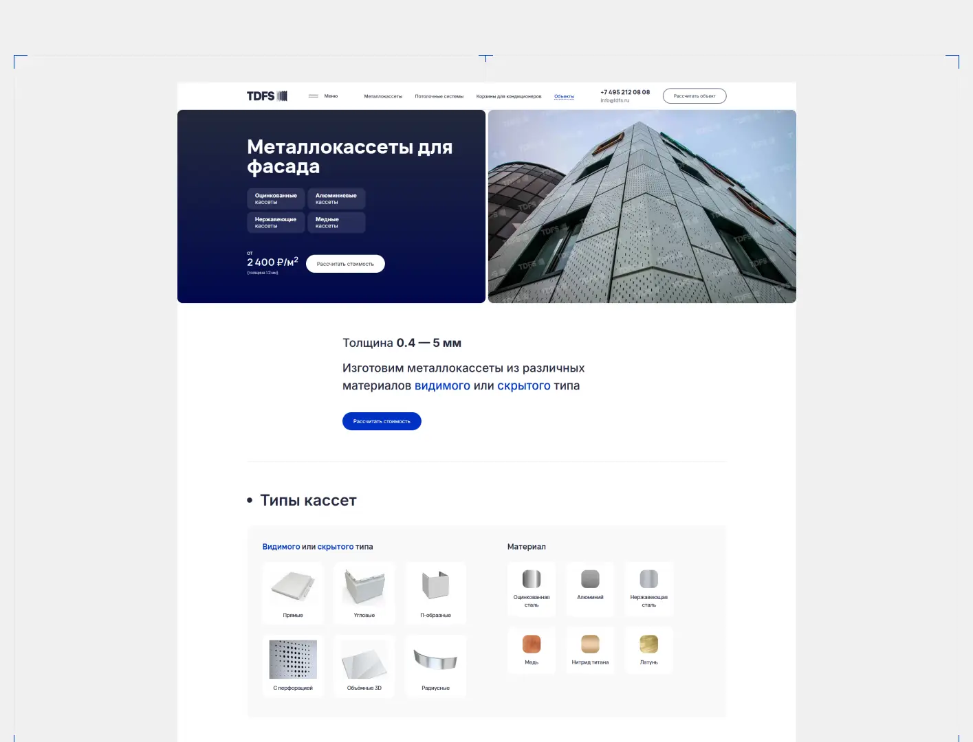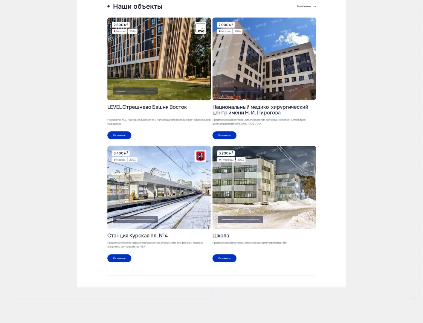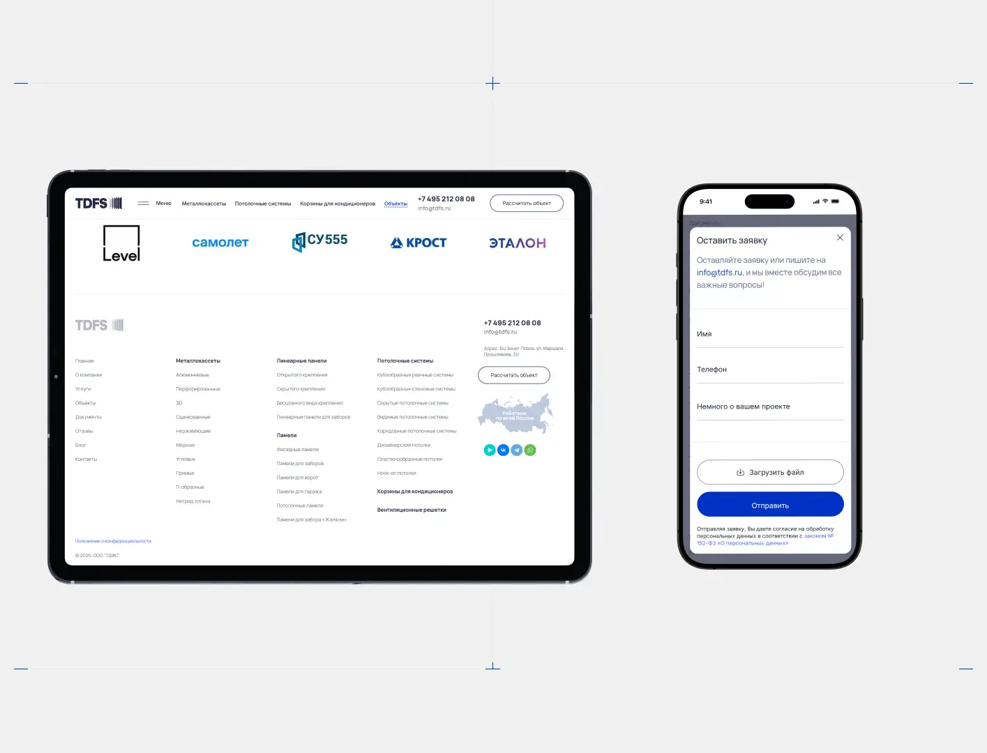 Разработали корпоративный сайт‑каталог для TDFS — производителя металлокассет для фасадов. Стильный дизайн, адаптивная вёрстка и удобный каталог с продуманной структурой. Представлены реализованные проекты для повышения доверия. Время загрузки страниц — менее 2 секунд, конверсия выросла на 35 %.