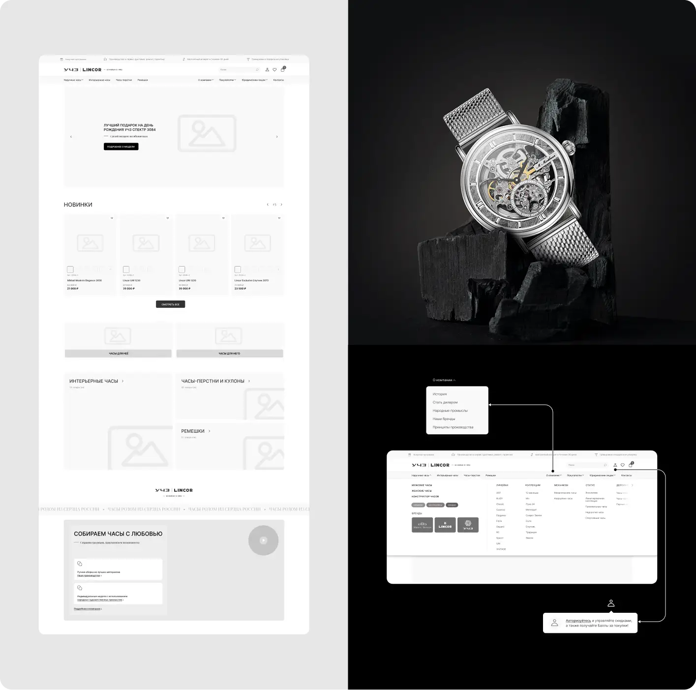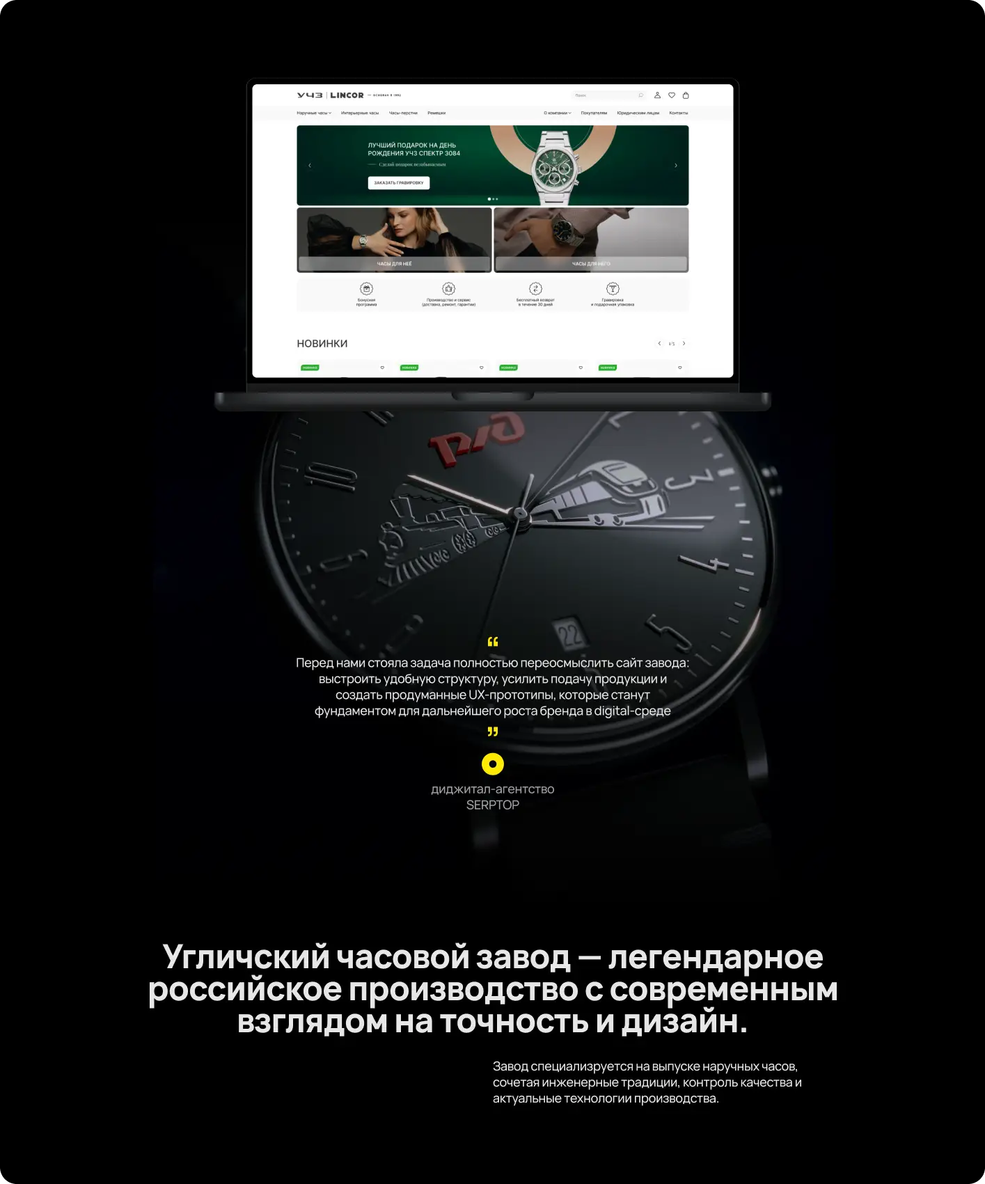 Разработали многофункциональный промо-сайт с каталогом для Угличского часового завода. Созданный прототип объединяет функции корпоративного портала, промо-лендинга и онлайн-каталога часов. Решение эффективно презентует историю бренда, демонстрирует коллекции и упрощает коммерческие запросы.
