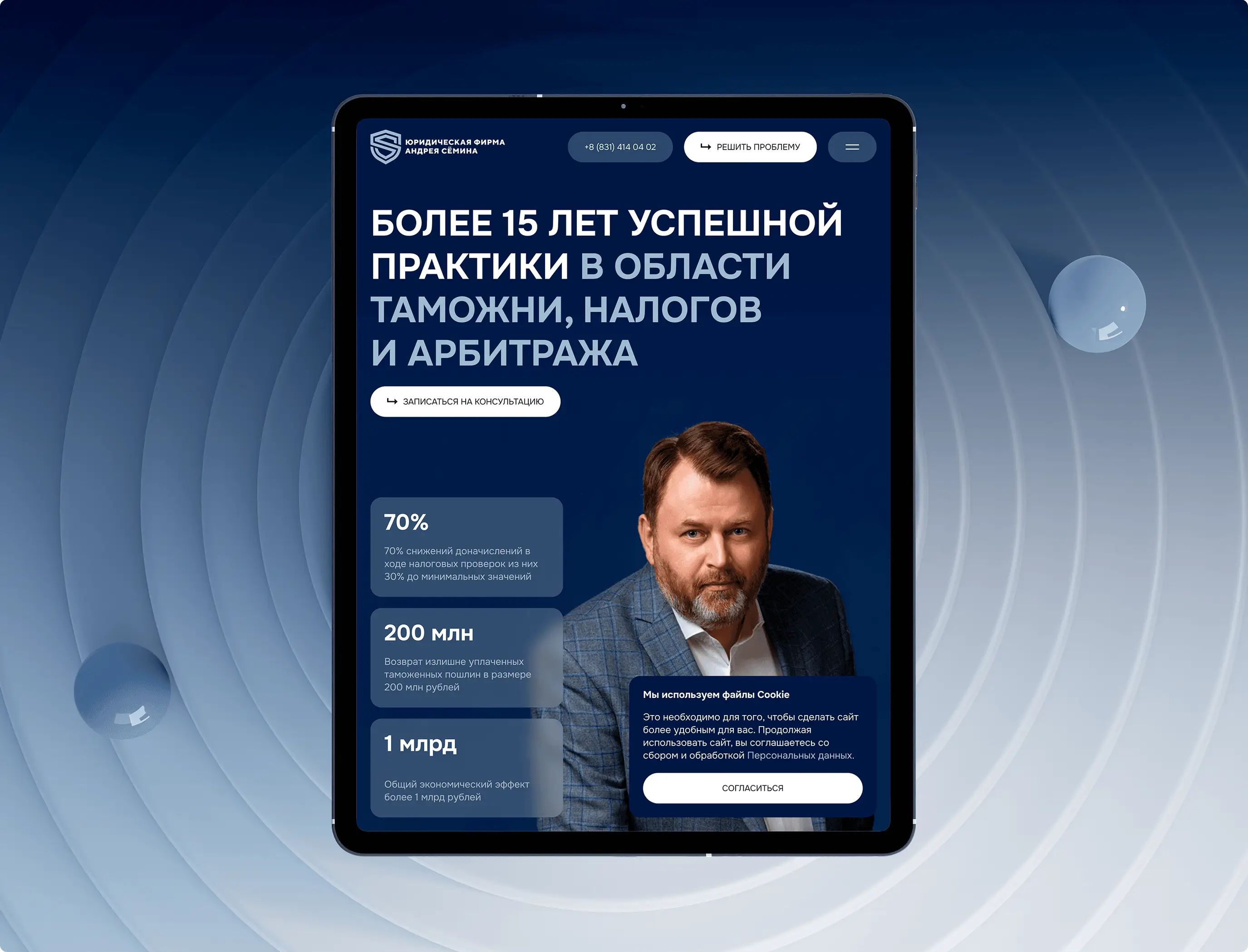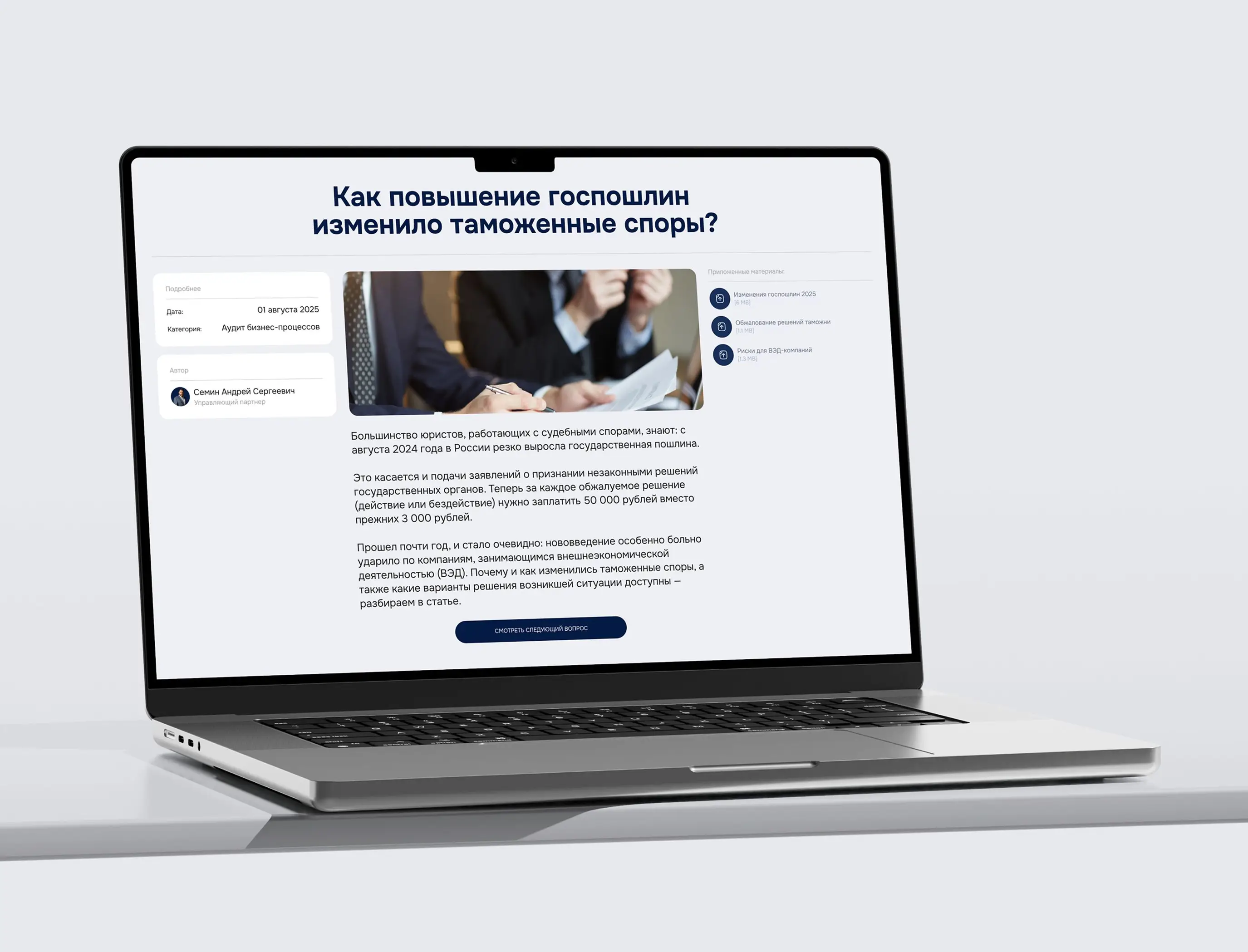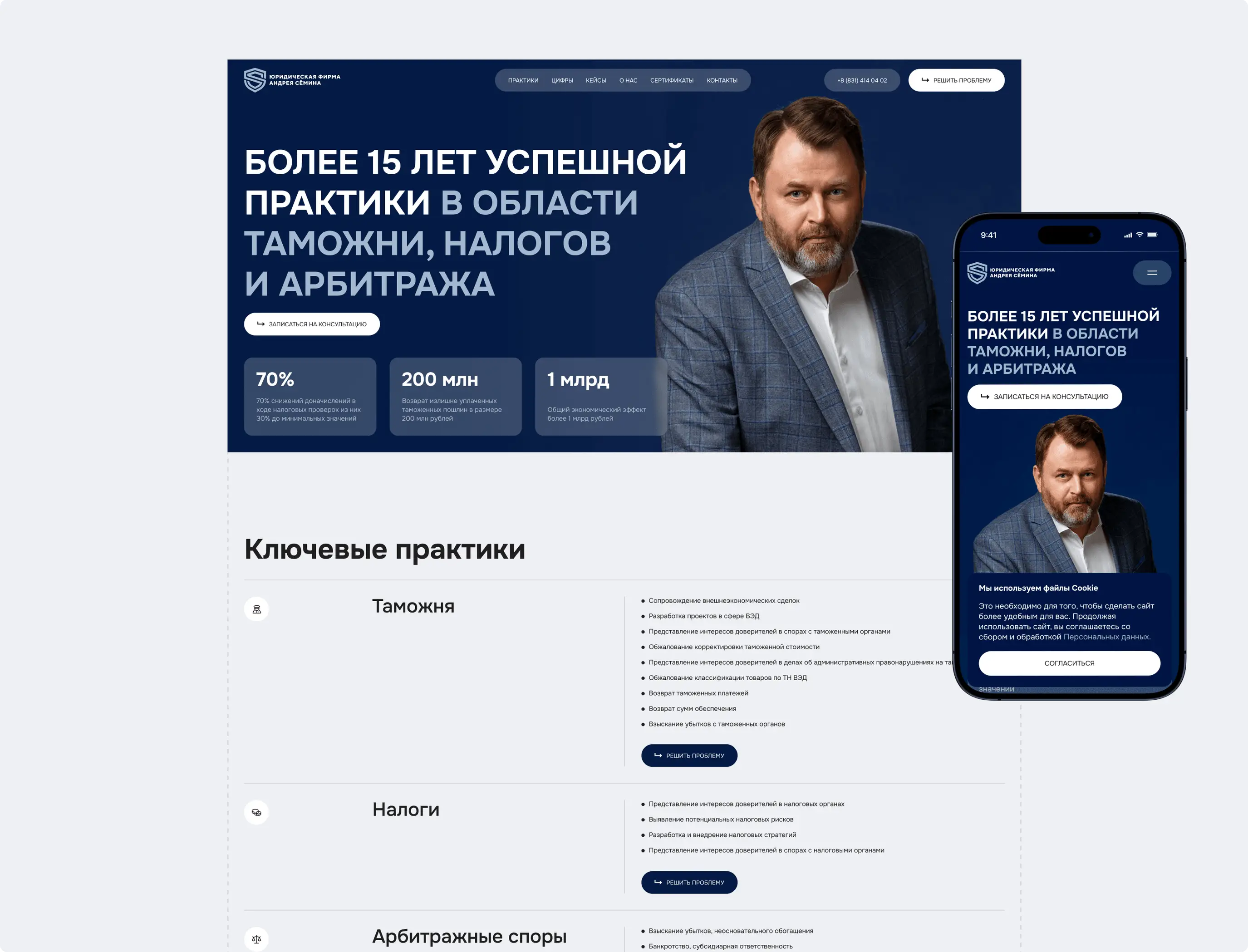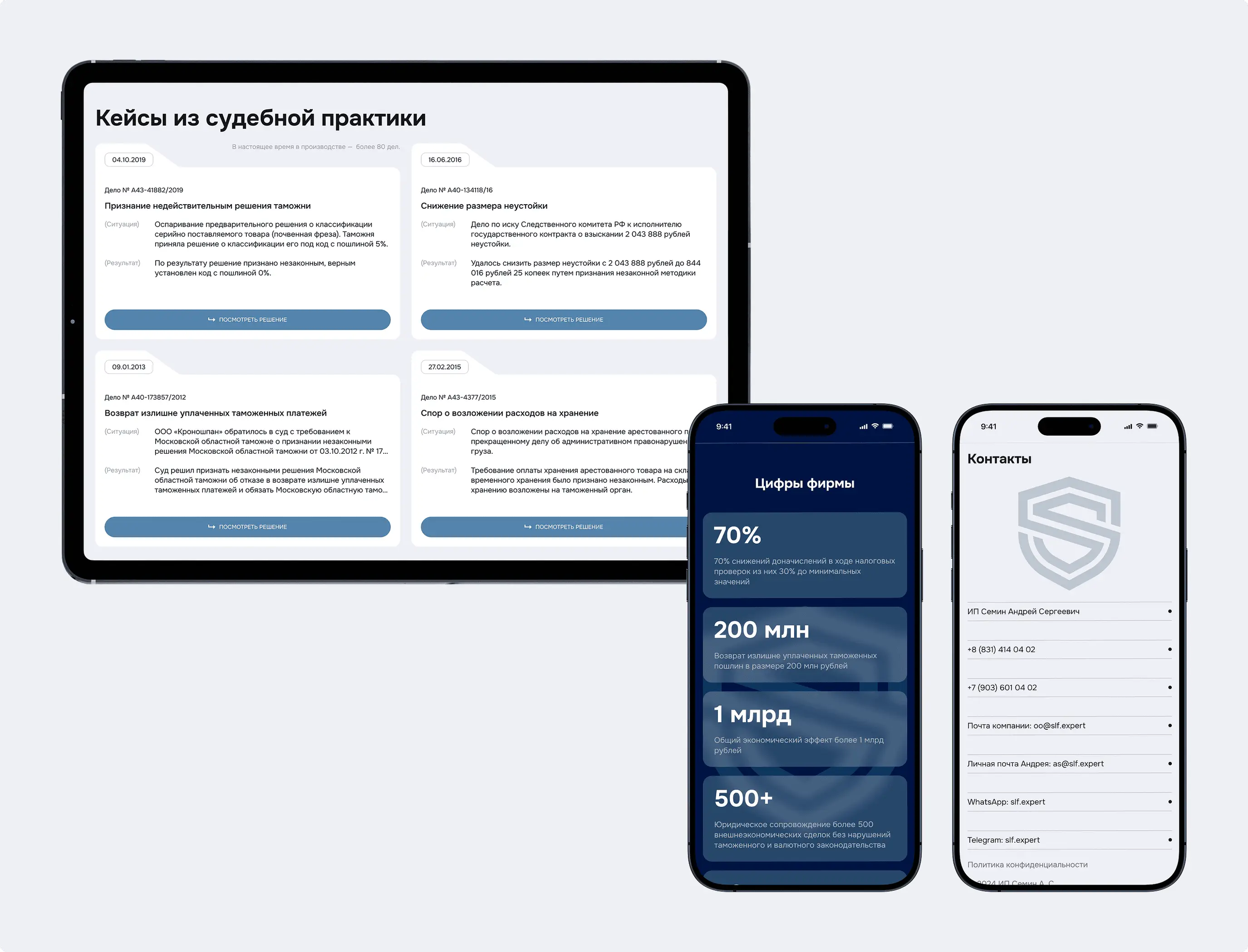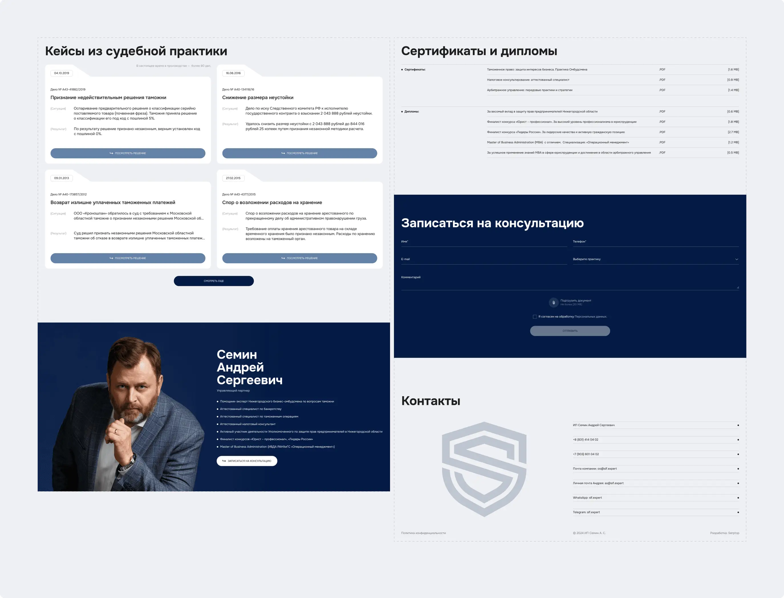 Разработан современный промо-сайт для юридической фирмы Андрея Семина. Создана четкая структура услуг, адаптивный дизайн и проведена комплексная SEO-оптимизация для привлечения целевой аудитории. Для повышения удобства клиентов реализована функция онлайн-оплаты консультаций. Проект укрепляет деловую репутацию компании, повышает доверие и обеспечивает клиентам комфортный доступ к юридической помощи.